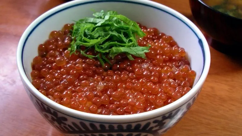 Ikuradon [いくら丼] temperado de ikura [ovas de salmão] no arroz.